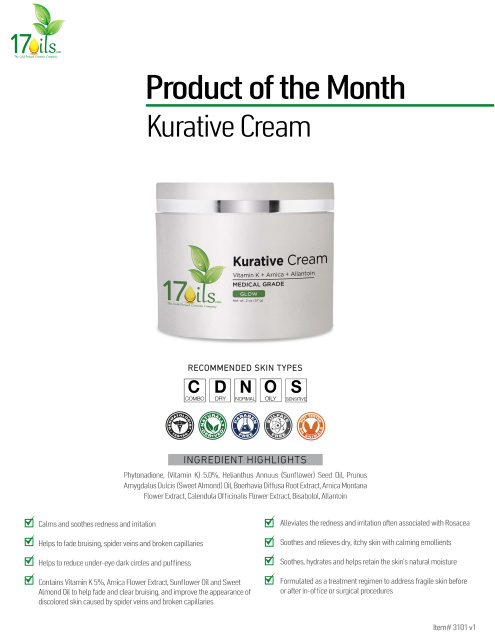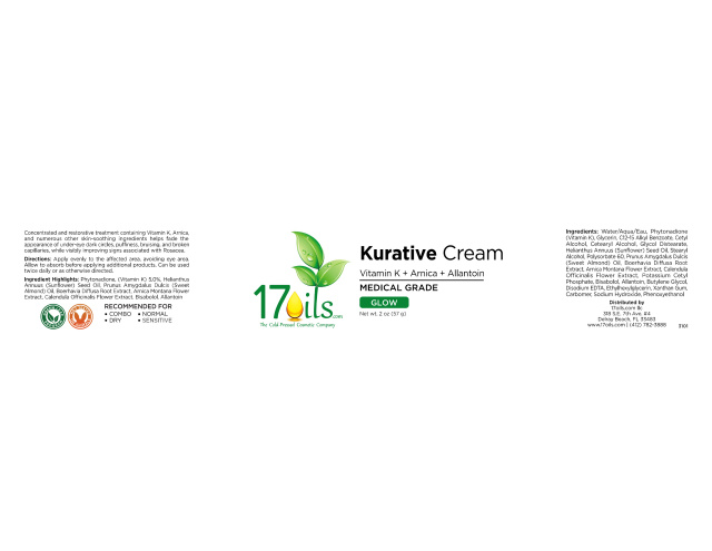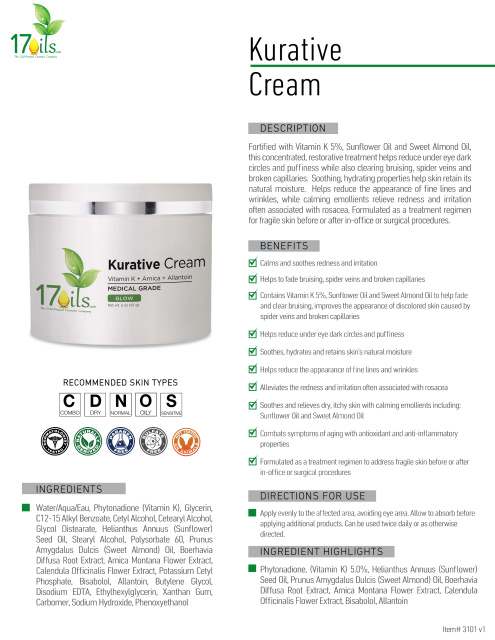 Kurative Cream from 17oils is a Concentrated and restorative treatment containing Vitamin K, Arnica,and numerous other skin-soothing ingredients to help fade the appearance of under-eye dark circles, puffiness, bruising, and broken capillaries, while visibly improving signs associated with Rosacea.